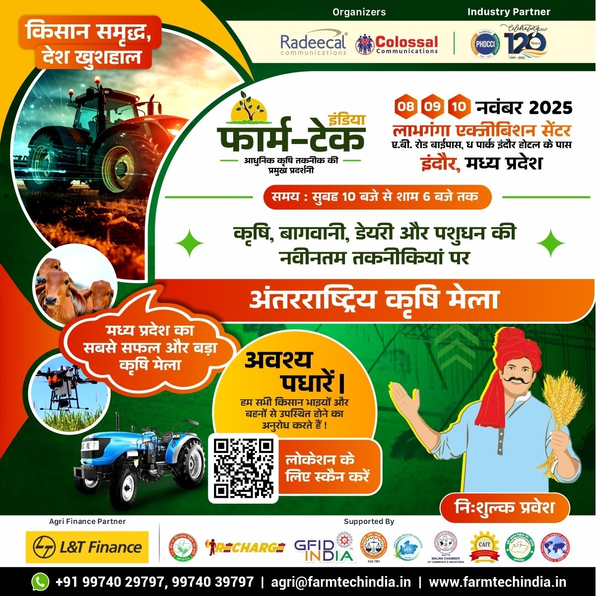 "फार्म टेक इंडिया" नामक आधुनिक कृषि तकनीकी की प्रदर्शनी 8 से 10 नवंबर 2025 तक लाभगंगा,इंदौर में प्रदर्शनी केंद्र में आयोजित की जाएगी.